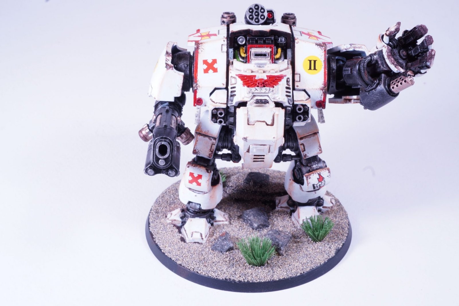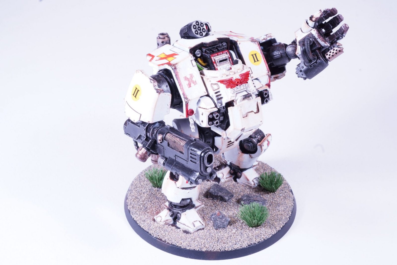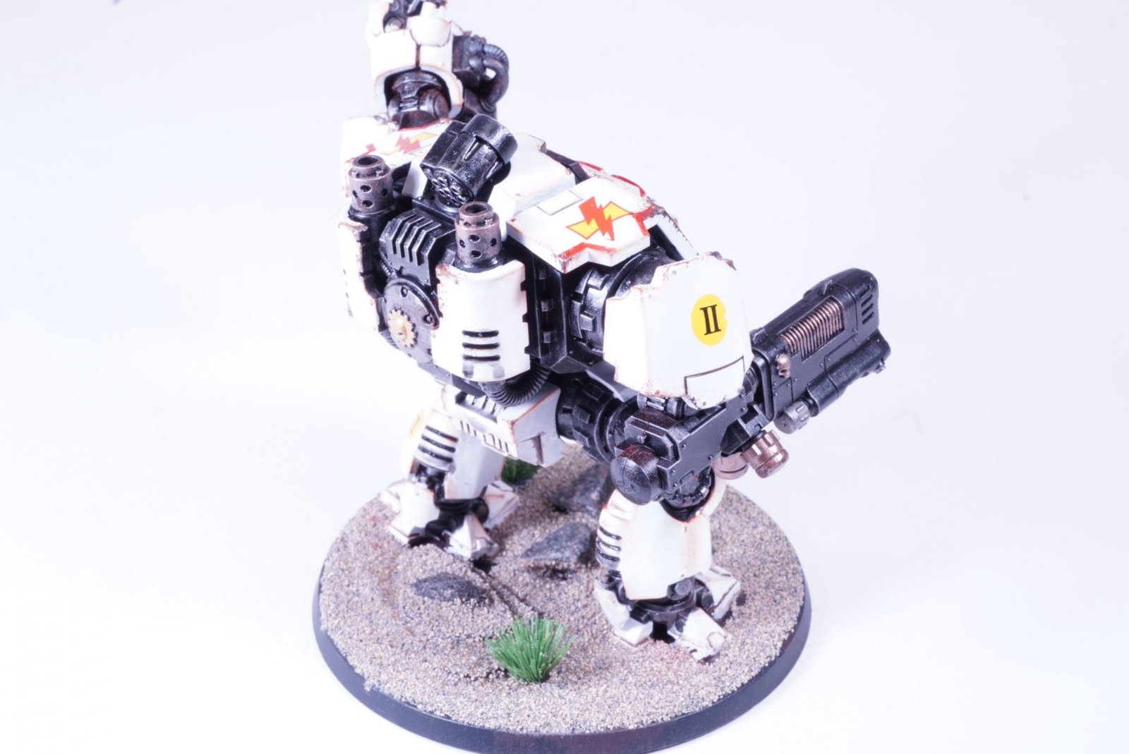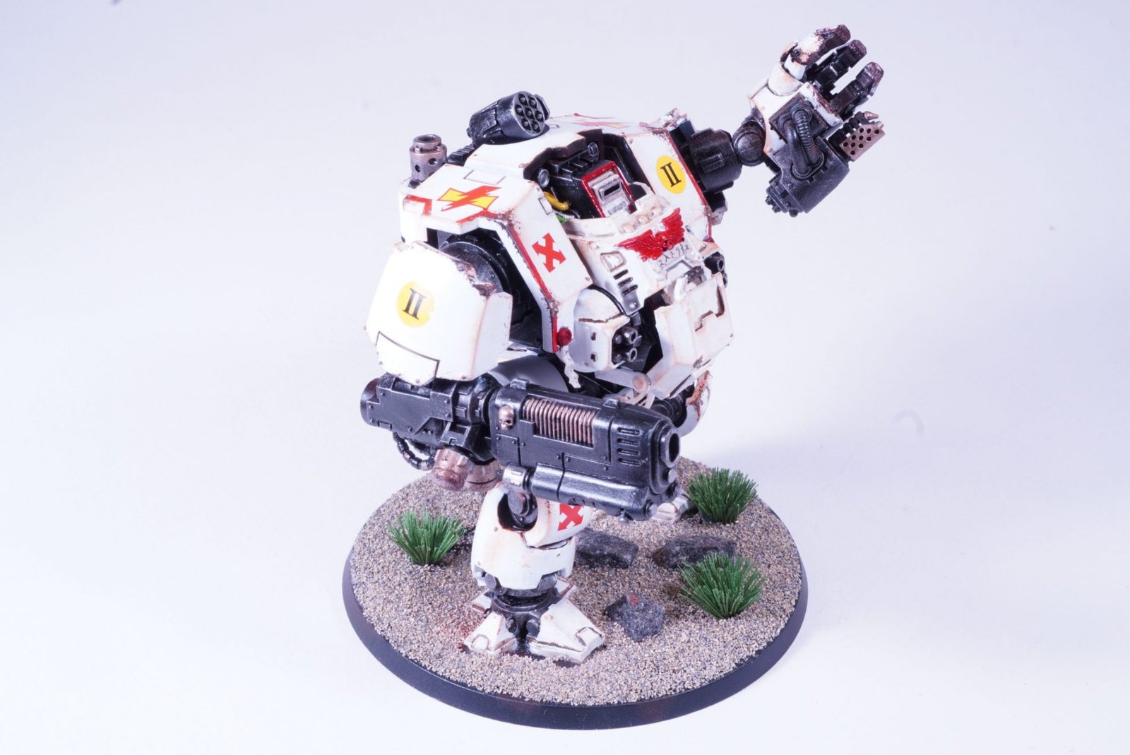 Commissioned to the White Scars Chapter and painted in White Scar colors and insignia. White Scars are know for their speed and effectiveness as a fast attack army. The model was painted as components and it was quite an effort. Next time we paint the model in two components only. The white paint was a real pain. There are in places over 6 coats of white paint, trying to provider coverage. Only spaying the paint provides smooth and effective covering. Next time I’m painting the white base on the entire model in an enamel pure white. The dreadnought will soon be alongside a collection of motorbikes which are favorites of the White Scars.