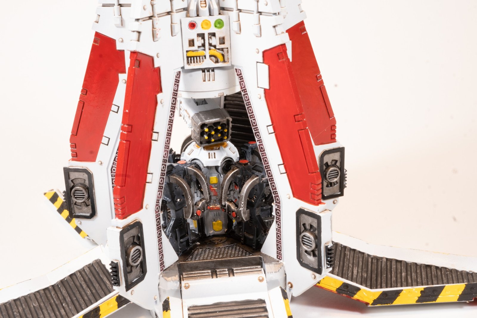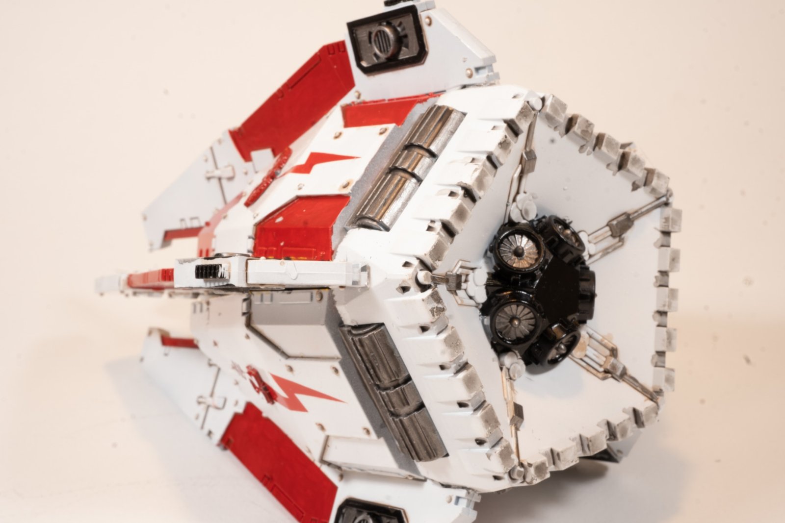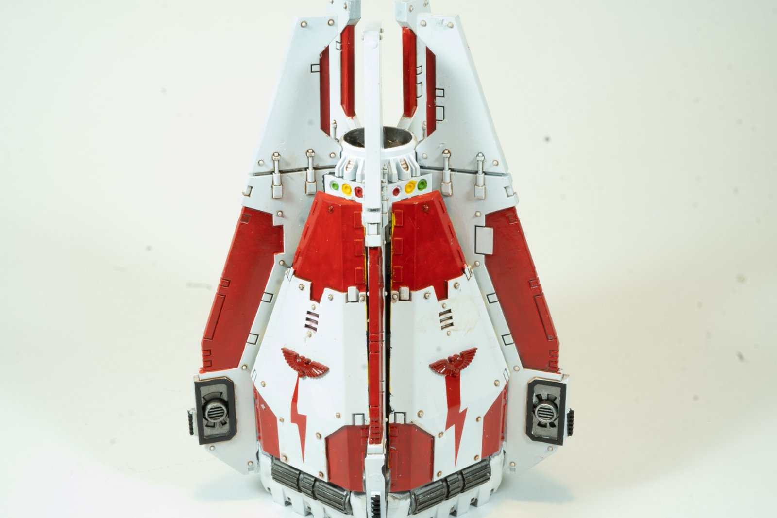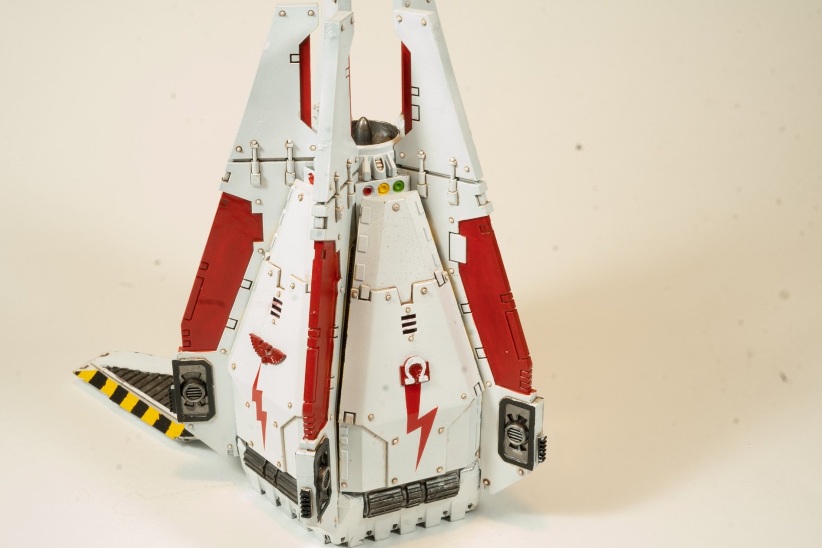 This is the common military transport for Space Marines as deployed to planetary campaigns. I created this as a White Scars chapter craft in preparation for a Diorama under planning. It is a large model with lots of room for weathering on the painting to provider somewhat realistic effects. As the Drop Pod simply crashes into the planetary surface, the normal appearance would seem to be a partially buried craft with cratering and surface impact marks evident.
