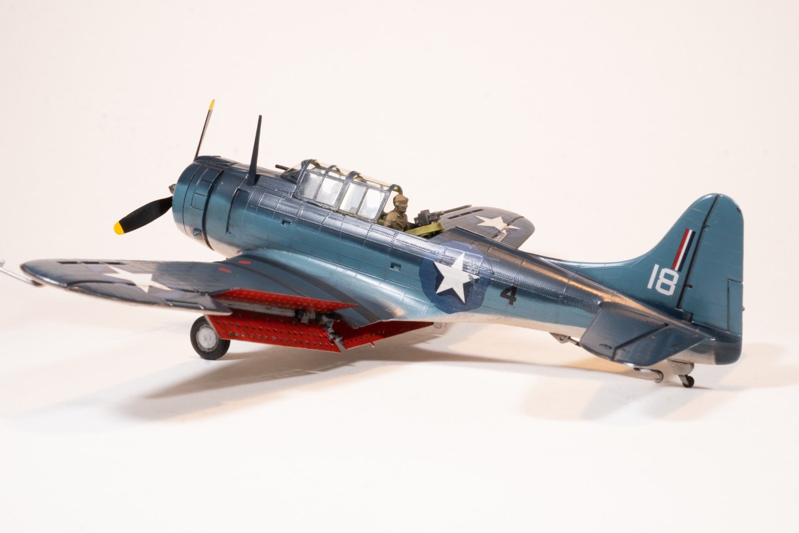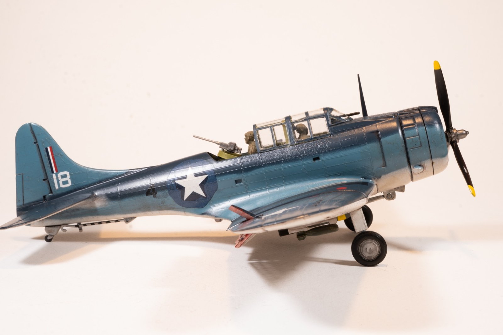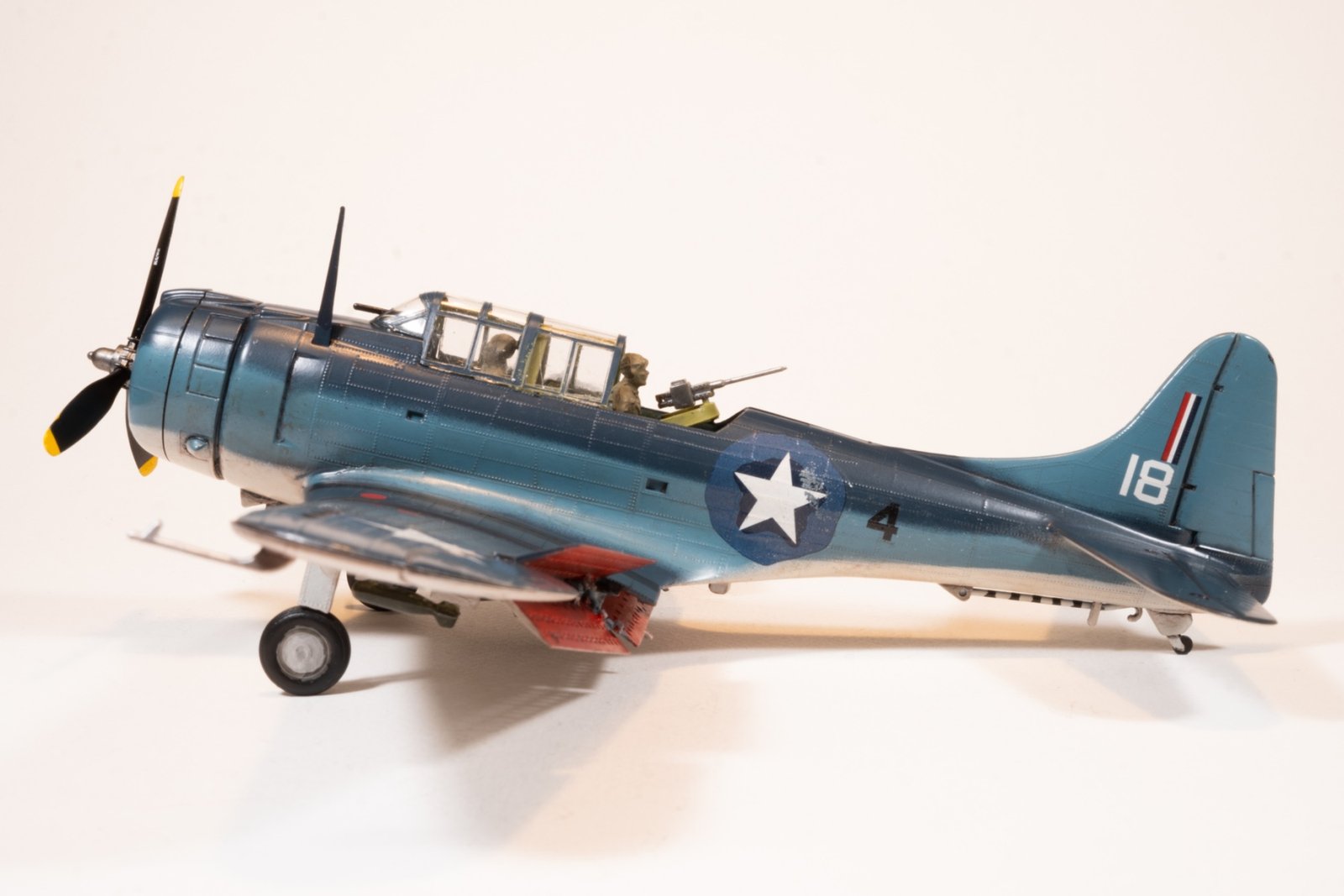 The Douglas SBD Dauntless is a World War II American naval scout plane and dive bomber that was manufactured by Douglas Aircraft from 1940 through 1944. The SBD (“Scout Bomber Douglas”) was the United States Navy’s main carrier-based scout/dive bomber from mid-1940 through mid-1944. The SBD was also flown by the United States Marine Corps, both from land air bases and aircraft carriers. The SBD is best remembered as the bomber that delivered the fatal blows to the Japanese carriers at the Battle of Midway in June 1942. The type earned its nickname “Slow But Deadly” (from its SBD initials) during this period.