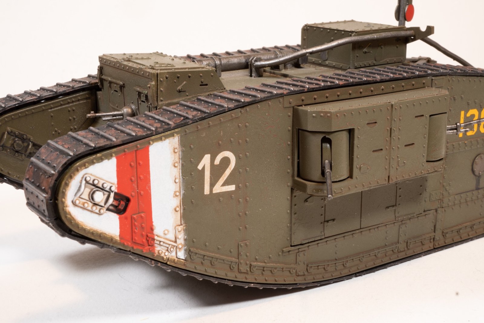 Production of the Mark V started at Metropolitan Carriage & Wagon at the end of 1917; the first tanks arrived in France in May 1918. Four hundred were built, 200 Males and Females; the “Males” armed with 6-pounder (57 mm) guns and machine guns, the “Females” with machine guns only. Several were converted to Hermaphrodites (sometimes known as “Mark V Composite”) by fitting one male and one female sponson. This measure was intended to ensure that female tanks would not be outgunned when faced with captured British male tanks in German use, or the Germans’ own A7V.