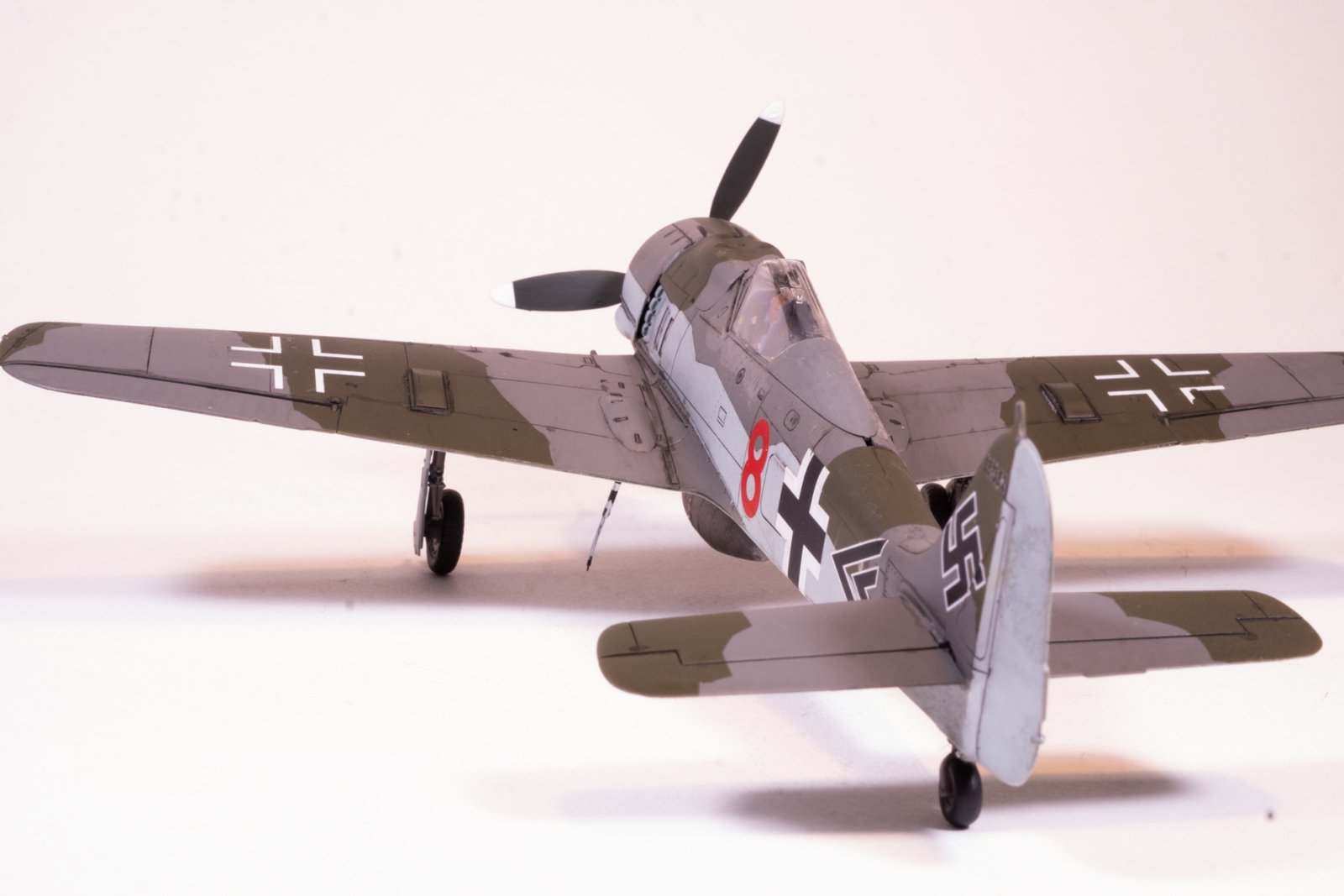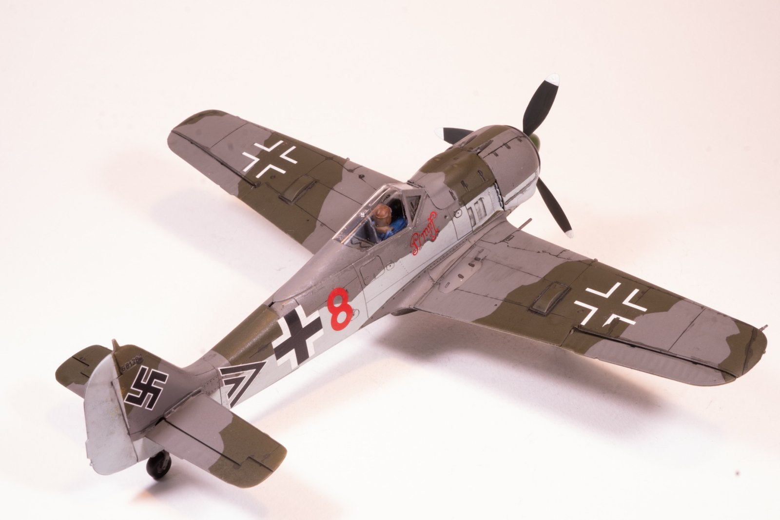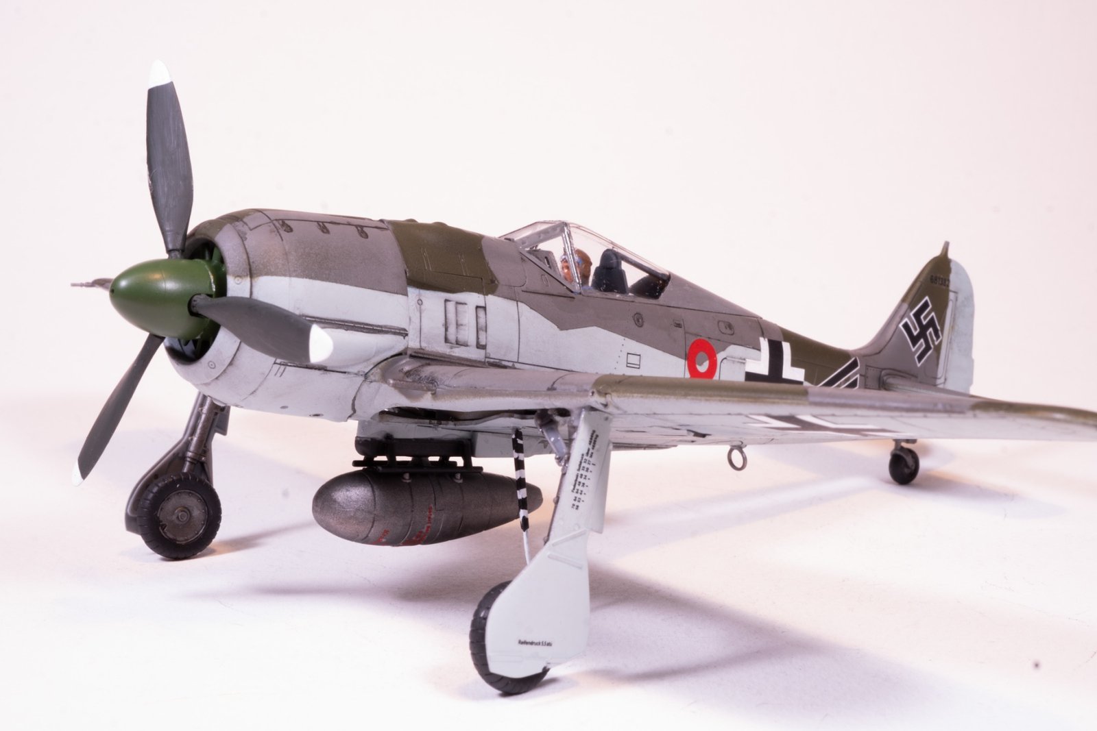 The Focke-Wulf Fw 190, nicknamed Würger (“Shrike”) is a German single-seat, single-engine fighter aircraft designed by Kurt Tank at Focke-Wulf in the late 1930s and widely used during World War II. Along with its well-known counterpart, the Messerschmitt Bf 109, the Fw 190 became the backbone of the Jagdwaffe (Fighter Force) of the Luftwaffe. The twin-row BMW 801 radial engine that powered most operational versions enabled the Fw 190 to lift larger loads than the Bf 109, allowing its use as a day fighter, fighter-bomber, ground-attack aircraft and to a lesser degree, night fighter.